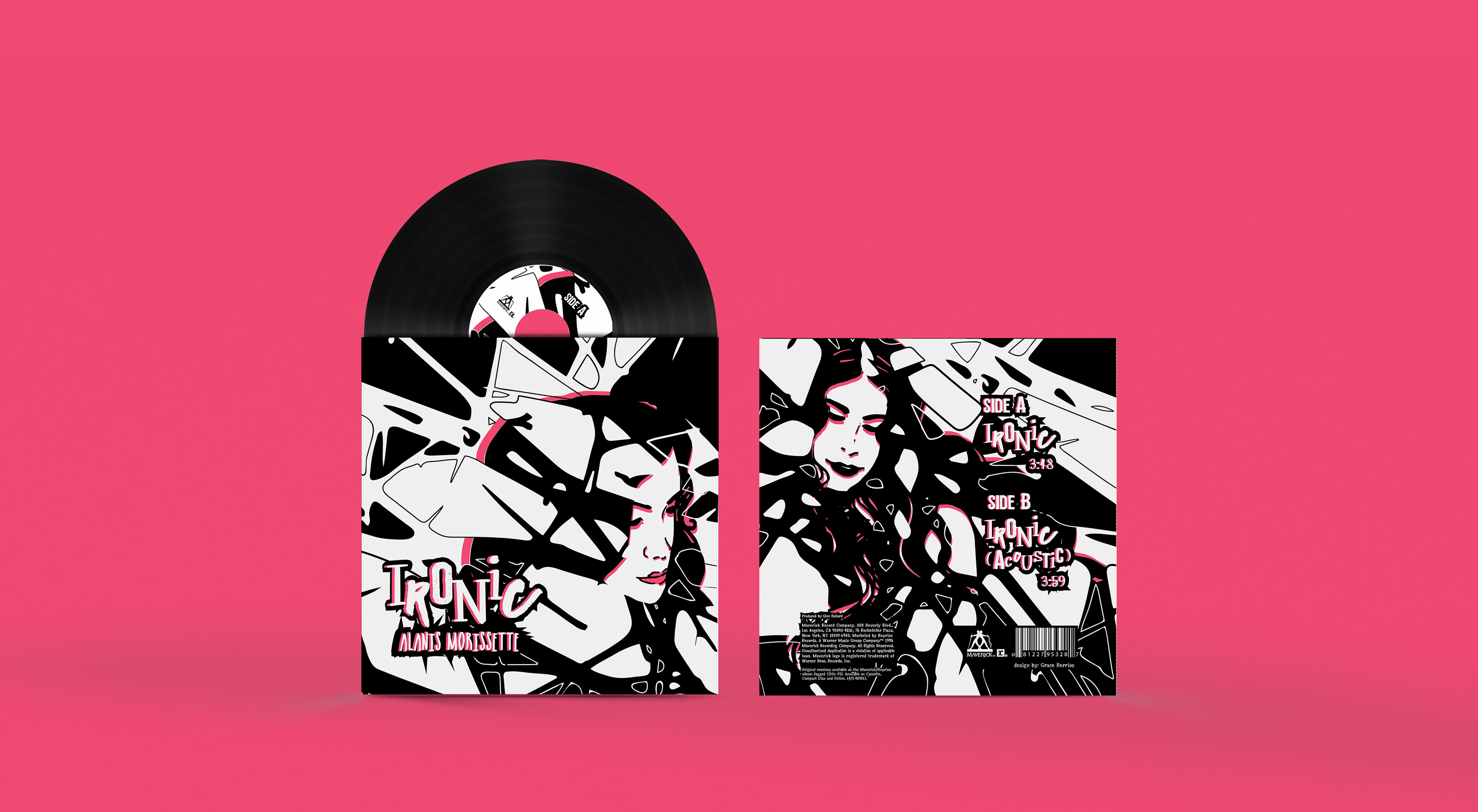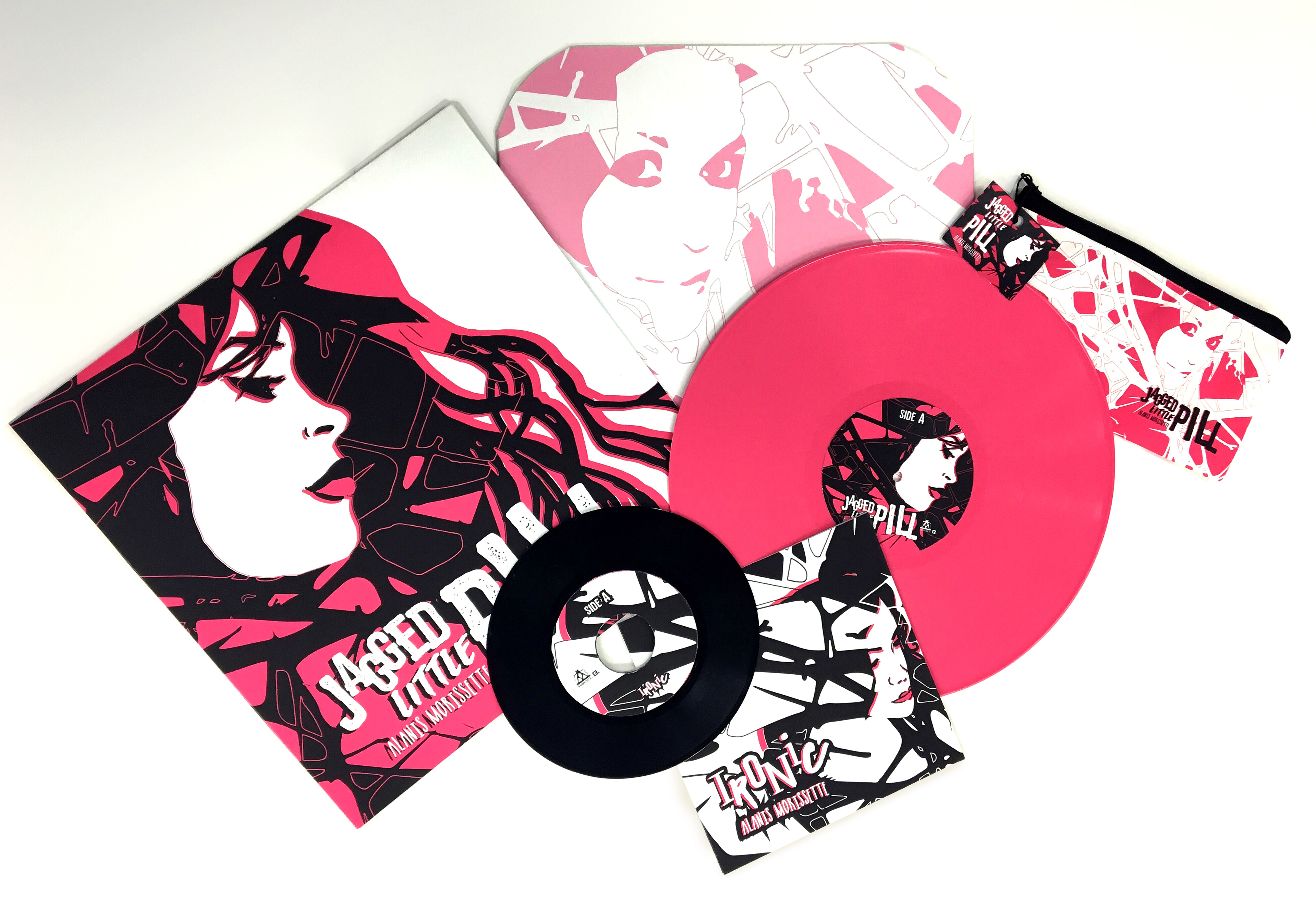 The design includes a 12” LP record, a 7” single for the hit “Ironic” and a collateral promotional item that reinforces the jagged design.