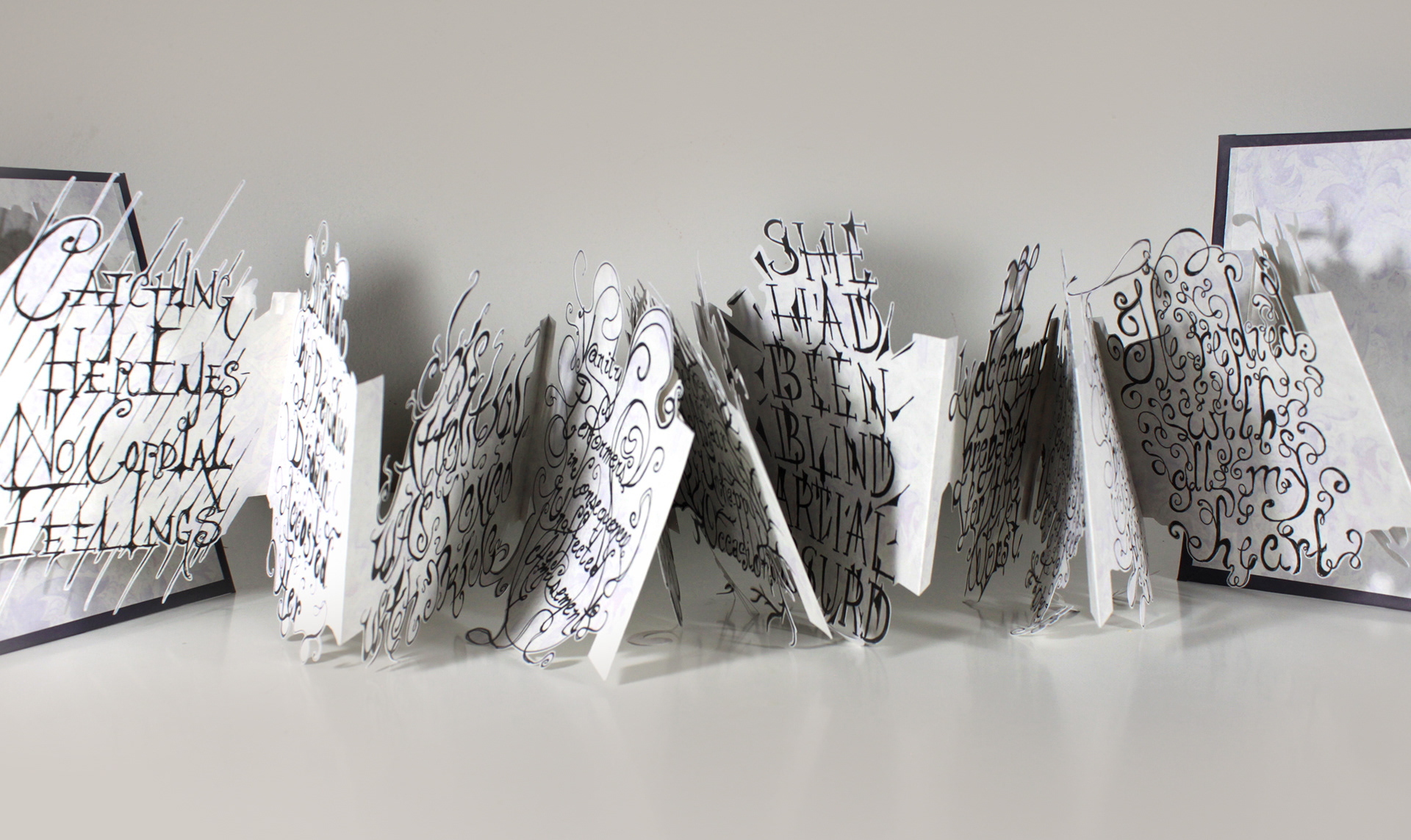 The challenge was to tell key moments in the story in the form of 6 word sentences. Each page, including the cover, was hand lettered, then laser cut and assembled into an accordion book format.